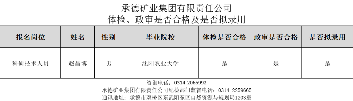 公示:承德礦業(yè)集團(tuán)有限責(zé)任公司體檢、政審是否合格及是否擬錄用